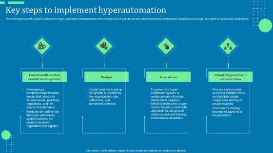 This slide represents the steps to be taken for hyper-automation implementation in the company and it includes functionalities that should be integrated, budget, ease of usage, and extent of spread and collaboration.Retrieve professionally designed Key Steps To Implement Hyperautomation Hyperautomation Software Solutions IT Template PDF to effectively convey your message and captivate your listeners. Save time by selecting pre-made slideshows that are appropriate for various topics, from business to educational purposes. These themes come in many different styles, from creative to corporate, and all of them are easily adjustable and can be edited quickly. Access them as PowerPoint templates or as Google Slides themes. You do not have to go on a hunt for the perfect presentation because Slidegeeks got you covered from everywhere.