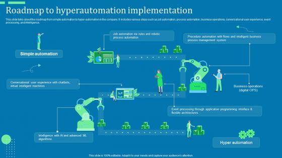 This slide talks about the roadmap from simple automation to hyper-automation in the company. It includes various steps such as job automation, process automation, business operations, conversational user experience, event processing, and Intelligence.Boost your pitch with our creative Roadmap To Hyperautomation Implementation Hyperautomation Software Solutions IT Introduction PDF. Deliver an awe-inspiring pitch that will mesmerize everyone. Using these presentation templates you will surely catch everyones attention. You can browse the ppts collection on our website. We have researchers who are experts at creating the right content for the templates. So you do not have to invest time in any additional work. Just grab the template now and use them.