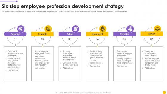This slide shows process which can be used to create employee career progression plan. It covers information about various stages which are organize, evaluate, define, implement, consider and review. Pitch your topic with ease and precision using this Six Step Employee Profession Development Strategy Icons Pdf. This layout presents information on Organize, Evaluate, Define. It is also available for immediate download and adjustment. So, changes can be made in the color, design, graphics or any other component to create a unique layout. This slide shows process which can be used to create employee career progression plan. It covers information about various stages which are organize, evaluate, define, implement, consider and review.