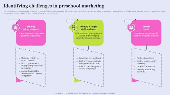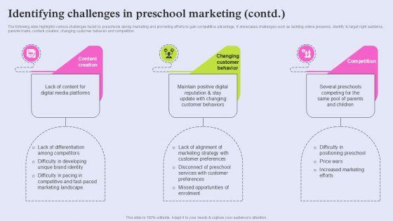 The following slide highlights various challenges faced by preschools during marketing and promoting efforts to gain competitive advantage. It showcases challenges such as building online presence, identify and target right audience, parents trusts, content creation, changing customer behavior and competition. Get a simple yet stunning designed Pre School Marketing Strategy To Enhance Enrollment Rate Identifying Challenges In Preschool Sample PDF. It is the best one to establish the tone in your meetings. It is an excellent way to make your presentations highly effective. So, download this PPT today from Slidegeeks and see the positive impacts. Our easy to edit Pre School Marketing Strategy To Enhance Enrollment Rate Identifying Challenges In Preschool Sample PDF can be your go to option for all upcoming conferences and meetings. So, what are you waiting for Grab this template today.