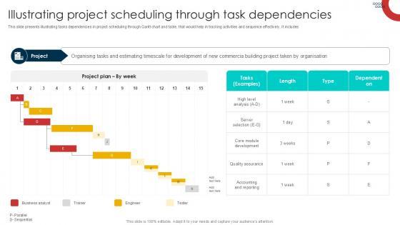 This slide presents illustrating tasks dependencies in project scheduling through Gantt chart and table, that would help in tracking activities and sequence effectively. It includes. Formulating a presentation can take up a lot of effort and time, so the content and message should always be the primary focus. The visuals of the PowerPoint can enhance the presenters message, so our Illustrating Project Scheduling Through Schedule Management Techniques PPT Example was created to help save time. Instead of worrying about the design, the presenter can concentrate on the message while our designers work on creating the ideal templates for whatever situation is needed. Slidegeeks has experts for everything from amazing designs to valuable content, we have put everything into Illustrating Project Scheduling Through Schedule Management Techniques PPT Example This slide presents illustrating tasks dependencies in project scheduling through Gantt chart and table, that would help in tracking activities and sequence effectively. It includes