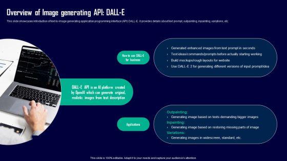 This slide showcases introduction of text-to-image generating application programming interface API DALL-E. it provides details about text prompt, outpainting, inpainting, variations, etc. Retrieve professionally designed Overview Of Image Generating API Dall E Creative Applications For Open AI Elements Pdf to effectively convey your message and captivate your listeners. Save time by selecting pre-made slideshows that are appropriate for various topics, from business to educational purposes. These themes come in many different styles, from creative to corporate, and all of them are easily adjustable and can be edited quickly. Access them as PowerPoint templates or as Google Slides themes. You do not have to go on a hunt for the perfect presentation because Slidegeeks got you covered from everywhere. This slide showcases introduction of text-to-image generating application programming interface API DALL-E. it provides details about text prompt, outpainting, inpainting, variations, etc.