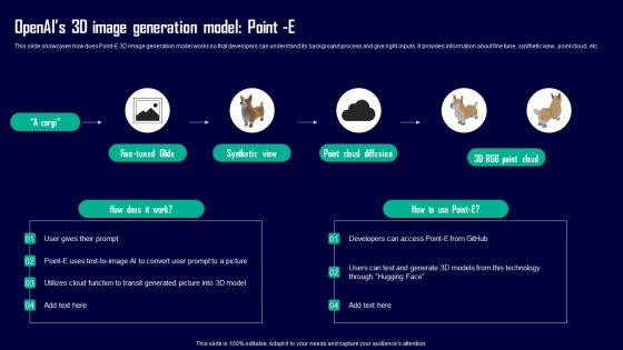 This slide showcases how does Point-E 3D image generation model works so that developers can understand its background process and give right inputs. It provides information about fine tune, synthetic view, point cloud, etc. The best PPT templates are a great way to save time, energy, and resources. Slidegeeks have 100 percent editable powerpoint slides making them incredibly versatile. With these quality presentation templates, you can create a captivating and memorable presentation by combining visually appealing slides and effectively communicating your message. Download Openais 3D Image Generation Model Point E Creative Applications For Open AI Introduction Pdf from Slidegeeks and deliver a wonderful presentation. This slide showcases how does Point-E 3D image generation model works so that developers can understand its background process and give right inputs. It provides information about fine tune, synthetic view, point cloud, etc.
