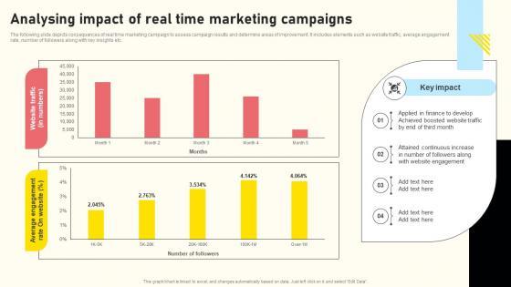 The following slide depicts consequences of real time marketing campaign to assess campaign results and determine areas of improvement. It includes elements such as website traffic, average engagement rate, number of followers along with key insights etc. Formulating a presentation can take up a lot of effort and time, so the content and message should always be the primary focus. The visuals of the PowerPoint can enhance the presenters message, so our Analysing Impact Of Real Time Marketing Campaigns Ppt Show Graphic Images PDF was created to help save time. Instead of worrying about the design, the presenter can concentrate on the message while our designers work on creating the ideal templates for whatever situation is needed. Slidegeeks has experts for everything from amazing designs to valuable content, we have put everything into Analysing Impact Of Real Time Marketing Campaigns Ppt Show Graphic Images PDF