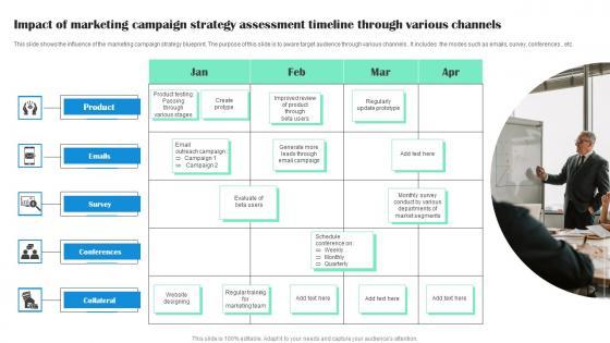 This slide shows the influence of the marketing campaign strategy blueprint. The purpose of this slide is to aware target audience through various channels . It includes the modes such as emails, survey, conferences , etc. Pitch your topic with ease and precision using this Impact Of Marketing Campaign Strategy Assessment Timeline Through Various Channels Diagrams Pdf This layout presents information on Product, Survey, Conferences, Collateral It is also available for immediate download and adjustment. So, changes can be made in the color, design, graphics or any other component to create a unique layout. This slide shows the influence of the marketing campaign strategy blueprint. The purpose of this slide is to aware target audience through various channels . It includes the modes such as emails, survey, conferences , etc.