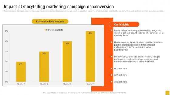 This slide depicts the impact storytelling campaign has on conversion rate that results in revenue growth on a quarterly basis. The KPIs included are divided on the basis of written, audio and video storytelling marketing formats. From laying roadmaps to briefing everything in detail, our templates are perfect for you. You can set the stage with your presentation slides. All you have to do is download these easy-to-edit and customizable templates. Impact Of Storytelling Marketing Campaign On Conversion Comprehensive Guide Mockup Pdf will help you deliver an outstanding performance that everyone would remember and praise you for. Do download this presentation today. This slide depicts the impact storytelling campaign has on conversion rate that results in revenue growth on a quarterly basis. The KPIs included are divided on the basis of written, audio and video storytelling marketing formats.