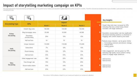 This slide depicts the impact storytelling campaign has over key performance metrics and valuable insights obtained over the course of 3 months. The KPIs included are divided on the basis of written, audio and video storytelling marketing formats. Coming up with a presentation necessitates that the majority of the effort goes into the content and the message you intend to convey. The visuals of a PowerPoint presentation can only be effective if it supplements and supports the story that is being told. Keeping this in mind our experts created v to reduce the time that goes into designing the presentation. This way, you can concentrate on the message while our designers take care of providing you with the right template for the situation.