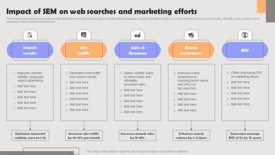 The following slide depicts some major benefits derived from executing search engine marketing SEM strategies to adopt cost-effective tactics. It includes elements such as search results, site traffic, sales, revenue, brand awareness, return on investment ROI etc. Coming up with a presentation necessitates that the majority of the effort goes into the content and the message you intend to convey. The visuals of a PowerPoint presentation can only be effective if it supplements and supports the story that is being told. Keeping this in mind our experts created Improving PPC Campaign Results Impact Of Sem On Web Searches And Marketing Slides Pdf to reduce the time that goes into designing the presentation. This way, you can concentrate on the message while our designers take care of providing you with the right template for the situation. The following slide depicts some major benefits derived from executing search engine marketing SEM strategies to adopt cost-effective tactics. It includes elements such as search results, site traffic, sales, revenue, brand awareness, return on investment ROI etc.