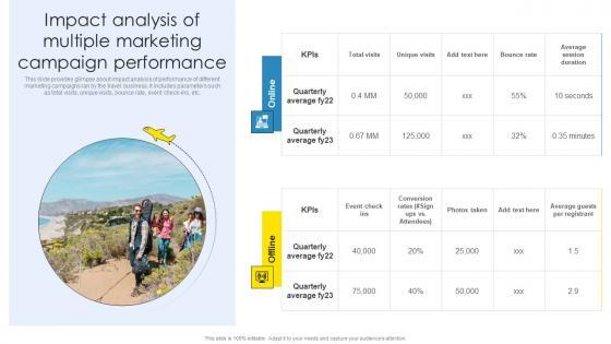 This slide provides glimpse about impact analysis of performance of different marketing campaigns ran by the travel business. It includes parameters such as total visits, unique visits, bounce rate, event check-ins, etc. This modern and well-arranged Strategic Marketing Plan Impact Analysis Of Multiple Marketing Campaign Introduction Pdf provides lots of creative possibilities. It is very simple to customize and edit with the Powerpoint Software. Just drag and drop your pictures into the shapes. All facets of this template can be edited with Powerpoint, no extra software is necessary. Add your own material, put your images in the places assigned for them, adjust the colors, and then you can show your slides to the world, with an animated slide included. This slide provides glimpse about impact analysis of performance of different marketing campaigns ran by the travel business. It includes parameters such as total visits, unique visits, bounce rate, event check-ins, etc.