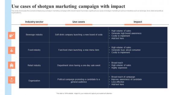 This slide showcases the scenario of deploying a shotgun marketing campaign with overall impact. It provides significant use cases of shotgun marketing in various industries such as beverage, food, retail and political organizations. Here you can discover an assortment of the finest PowerPoint and Google Slides templates. With these templates, you can create presentations for a variety of purposes while simultaneously providing your audience with an eye-catching visual experience. Download Use Cases Of Shotgun Marketing Campaign With Impact In Depth Overview Of Mass Elements Pdf to deliver an impeccable presentation. These templates will make your job of preparing presentations much quicker, yet still, maintain a high level of quality. Slidegeeks has experienced researchers who prepare these templates and write high-quality content for you. Later on, you can personalize the content by editing the Use Cases Of Shotgun Marketing Campaign With Impact In Depth Overview Of Mass Elements Pdf This slide showcases the scenario of deploying a shotgun marketing campaign with overall impact. It provides significant use cases of shotgun marketing in various industries such as beverage, food, retail and political organizations.