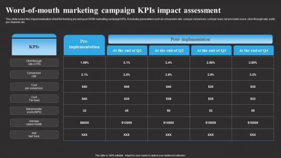 This slide covers the impact evaluation sheet for tracking pre and post-WOM marketing campaign KPIs. It includes parameters such as conversion rate, cost per conversion, cost per lead, net promoter score, click-through rate, visits per channel, etc. Slidegeeks is here to make your presentations a breeze with Word Of Mouth Marketing Campaign Kpis Impact Tracking Word Mouth Marketing Icons PDF With our easy-to-use and customizable templates, you can focus on delivering your ideas rather than worrying about formatting. With a variety of designs to choose from, you are sure to find one that suits your needs. And with animations and unique photos, illustrations, and fonts, you can make your presentation pop. So whether you are giving a sales pitch or presenting to the board, make sure to check out Slidegeeks first This slide covers the impact evaluation sheet for tracking pre and post-WOM marketing campaign KPIs. It includes parameters such as conversion rate, cost per conversion, cost per lead, net promoter score, click-through rate, visits per channel, etc.