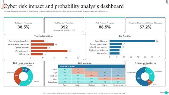 This slide defines the dashboard for analyzing the cyber risk impact and likelihood. It includes information related to the risk, rating and vulnerabilities. Showcasing this set of slides titled Cyber Risk Impact And Probability Analysis Dashboard Brochure PDF. The topics addressed in these templates are Risk Heat Map, Risk Rating Breakdown, Vulnerabilities. All the content presented in this PPT design is completely editable. Download it and make adjustments in color, background, font etc. as per your unique business setting.