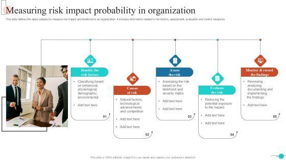 This slide defines the steps adopted to measure risk impact and likelihood in an organization. It includes information related to risk factors, assessment, evaluation and control measures. Presenting Measuring Risk Impact Probability In Organization Professional PDF to dispense important information. This template comprises five stages. It also presents valuable insights into the topics including Causes Risk, Assess Risk, Evaluate Risk . This is a completely customizable PowerPoint theme that can be put to use immediately. So, download it and address the topic impactfully.