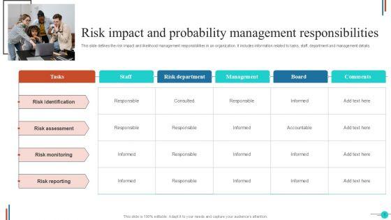 This slide defines the risk impact and likelihood management responsibilities in an organization. It includes information related to tasks, staff, department and management details. Presenting Risk Impact And Probability Management Responsibilities Background PDF to dispense important information. This template comprises one stages. It also presents valuable insights into the topics including Risk Identification, Risk Assessment, Risk Monitoring . This is a completely customizable PowerPoint theme that can be put to use immediately. So, download it and address the topic impactfully.
