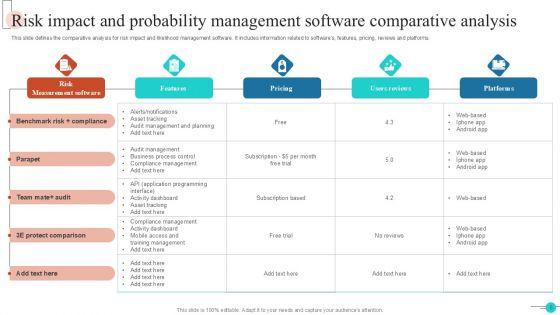 This slide defines the comparative analysis for risk impact and likelihood management software. It includes information related to softwares, features, pricing, reviews and platforms. Showcasing this set of slides titled Risk Impact And Probability Management Software Comparative Analysis Mockup PDF. The topics addressed in these templates are Benchmark Risk Compliance, Parapet, Team Mate Audit . All the content presented in this PPT design is completely editable. Download it and make adjustments in color, background, font etc. as per your unique business setting.