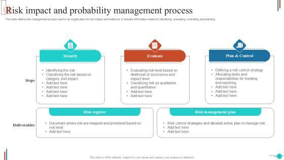 This slide defines the management process used in an organization for risk impact and likelihood. It includes information related to Identifying, evaluating, controlling and planning. Presenting Risk Impact And Probability Management Process Slides PDF to dispense important information. This template comprises three stages. It also presents valuable insights into the topics including Identify, Evaluate, Plan Control . This is a completely customizable PowerPoint theme that can be put to use immediately. So, download it and address the topic impactfully.