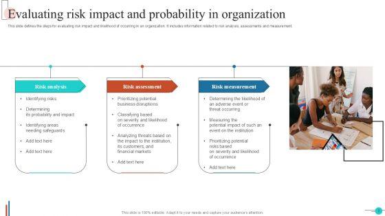 This slide defines the steps for evaluating risk impact and likelihood of occurring in an organization. It includes information related to risk analysis, assessments and measurement. Presenting Evaluating Risk Impact And Probability In Organization Introduction PDF to dispense important information. This template comprises three stages. It also presents valuable insights into the topics including Risk Analysis, Risk Assessment, Risk Measurement. This is a completely customizable PowerPoint theme that can be put to use immediately. So, download it and address the topic impactfully.