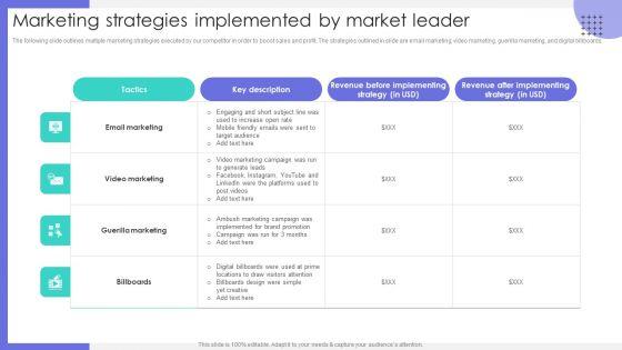 The following slide outlines multiple marketing strategies executed by our competitor in order to boost sales and profit. The strategies outlined in slide are email marketing, video marketing, guerilla marketing, and digital billboards. Explore a selection of the finest Marketing Strategies Implemented By Market Leader Ppt PowerPoint Presentation File Background Images PDF here. With a plethora of professionally designed and pre made slide templates, you can quickly and easily find the right one for your upcoming presentation. You can use our Marketing Strategies Implemented By Market Leader Ppt PowerPoint Presentation File Background Images PDF to effectively convey your message to a wider audience. Slidegeeks has done a lot of research before preparing these presentation templates. The content can be personalized and the slides are highly editable. Grab templates today from Slidegeeks.