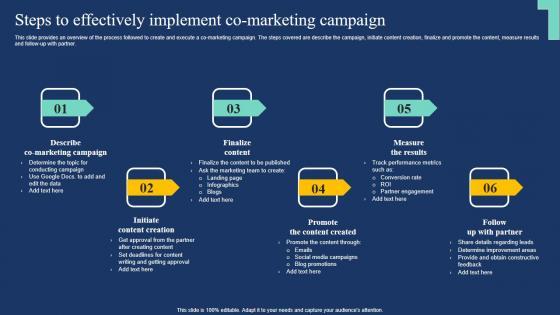 This slide provides an overview of the process followed to create and execute a co-marketing campaign. The steps covered are describe the campaign, initiate content creation, finalize and promote the content, measure results and follow-up with partner. Slidegeeks is here to make your presentations a breeze with Steps To Effectively Implement Co Marketing Market Expansion Tactic Infographics Pdf With our easy-to-use and customizable templates, you can focus on delivering your ideas rather than worrying about formatting. With a variety of designs to choose from, you are sure to find one that suits your needs. And with animations and unique photos, illustrations, and fonts, you can make your presentation pop. So whether you are giving a sales pitch or presenting to the board, make sure to check out Slidegeeks first This slide provides an overview of the process followed to create and execute a co-marketing campaign. The steps covered are describe the campaign, initiate content creation, finalize and promote the content, measure results and follow-up with partner.