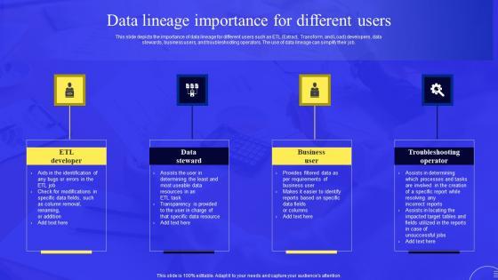 This slide depicts the importance of data lineage for different users such as ETL Extract, Transform, and Load developers, data stewards, business users, and troubleshooting operators. The use of data lineage can simplify their job.If your project calls for a presentation, then Slidegeeks is your go-to partner because we have professionally designed, easy-to-edit templates that are perfect for any presentation. After downloading, you can easily edit Data Lineage Importance For Different Users Deploying Data Lineage IT Slides PDF and make the changes accordingly. You can rearrange slides or fill them with different images. Check out all the handy templates.