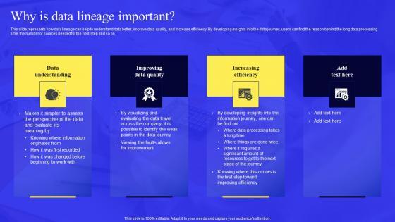 This slide represents how data lineage can help to understand data better, improve data quality, and increase efficiency. By developing insights into the data journey, users can find the reason behind the long data processing time, the number of sources needed for the next step and so on. Do you have to make sure that everyone on your team knows about any specific topic I yes, then you should give Data Lineage Methods Why Is Data Lineage Important Template PDF a try. Our experts have put a lot of knowledge and effort into creating this impeccable Data Lineage Methods Why Is Data Lineage Important Template PDF. You can use this template for your upcoming presentations, as the slides are perfect to represent even the tiniest detail. You can download these templates from the Slidegeeks website and these are easy to edit. So grab these today