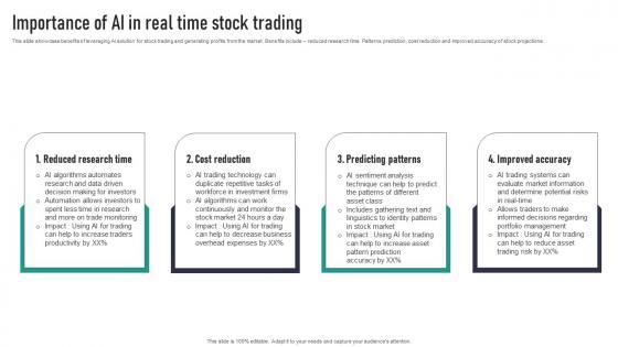 This slide showcase benefits of leveraging AI solution for stock trading and generating profits from the market. Benefits include reduced research time. Patterns prediction, cost reduction and improved accuracy of stock projections. Do you know about Slidesgeeks Importance Of AI In Real Time Stock Trading Pictures Pdf These are perfect for delivering any kind od presentation. Using it, create PowerPoint presentations that communicate your ideas and engage audiences. Save time and effort by using our pre-designed presentation templates that are perfect for a wide range of topic. Our vast selection of designs covers a range of styles, from creative to business, and are all highly customizable and easy to edit. Download as a PowerPoint template or use them as Google Slides themes. This slide showcase benefits of leveraging AI solution for stock trading and generating profits from the market. Benefits include reduced research time. Patterns prediction, cost reduction and improved accuracy of stock projections.
