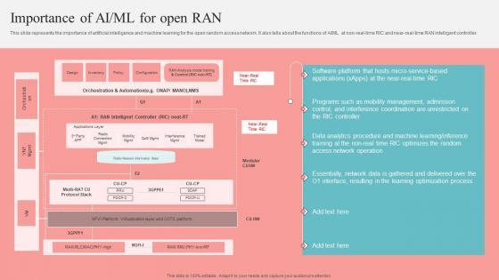 This slide represents the importance of artificial intelligence and machine learning for the open random access network. It also tells about the functions of AI or ML at non real time RIC and near real time RAN intelligent controller. This Open Radio Access Network IT Importance Of AI Ml For Open RAN Structure PDF from Slidegeeks makes it easy to present information on your topic with precision. It provides customization options, so you can make changes to the colors, design, graphics, or any other component to create a unique layout. It is also available for immediate download, so you can begin using it right away. Slidegeeks has done good research to ensure that you have everything you need to make your presentation stand out. Make a name out there for a brilliant performance.