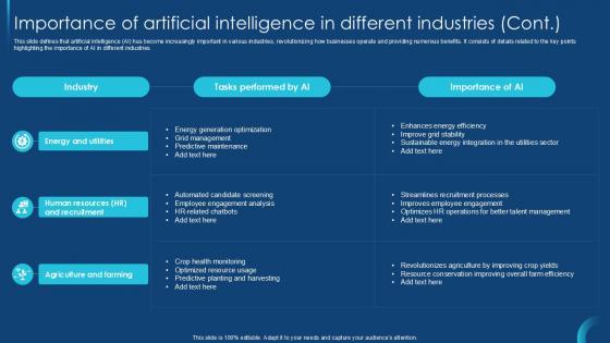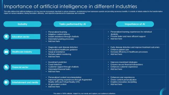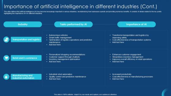 This slide defines that artificial intelligence AI has become increasingly important in various industries, revolutionizing how businesses operate and providing numerous benefits. It consists of details related to the transformative impact on various industries, driving innovation, efficiency, and improved experiences for businesses and consumer. Coming up with a presentation necessitates that the majority of the effort goes into the content and the message you intend to convey. The visuals of a PowerPoint presentation can only be effective if it supplements and supports the story that is being told. Keeping this in mind our experts created Importance Of Artificial Intelligence Self Guided GPT 4 PPT Sample CHATGPT SS V to reduce the time that goes into designing the presentation. This way, you can concentrate on the message while our designers take care of providing you with the right template for the situation. This slide defines that artificial intelligence AI has become increasingly important in various industries, revolutionizing how businesses operate and providing numerous benefits. It consists of details related to the transformative impact on various industries, driving innovation, efficiency, and improved experiences for businesses and consumer.