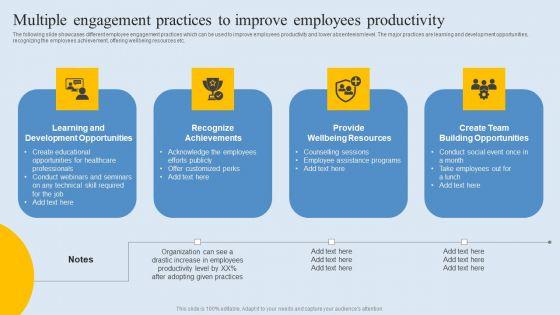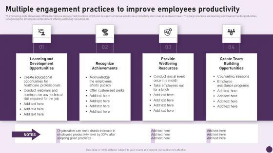 The following slide showcases different employee engagement practices which can be used to improve employees productivity and lower absenteeism level. The major practices are learning and development opportunities, recognizing the employees achievement, offering wellbeing resources etc. This Multiple Engagement Practices To Improve Employees Productivity Themes PDF from Slidegeeks makes it easy to present information on your topic with precision. It provides customization options, so you can make changes to the colors, design, graphics, or any other component to create a unique layout. It is also available for immediate download, so you can begin using it right away. Slidegeeks has done good research to ensure that you have everything you need to make your presentation stand out. Make a name out there for a brilliant performance.