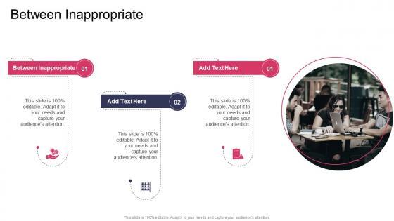 Introducing our well-designed Between Inappropriate In Powerpoint And Google Slides Cpb. This PowerPoint design presents information on topics like Between Inappropriate. As it is predesigned it helps boost your confidence level. It also makes you a better presenter because of its high-quality content and graphics. This PPT layout can be downloaded and used in different formats like PDF, PNG, and JPG. Not only this, it is available in both Standard Screen and Widescreen aspect ratios for your convenience. Therefore, click on the download button now to persuade and impress your audience. Our Between Inappropriate In Powerpoint And Google Slides Cpb are topically designed to provide an attractive backdrop to any subject. Use them to look like a presentation pro.