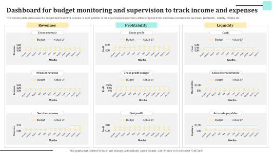 The following slide showcases the budget dashboard that enables to track whether or not project spending remains within budgeted limits. It includes elements like revenues, profitability, liquidity, months etc. Pitch your topic with ease and precision using this Dashboard For Budget Monitoring And Supervision To Track Income And Expenses Guidelines PDF. This layout presents information on Revenues, Profitability, Liquidity . It is also available for immediate download and adjustment. So, changes can be made in the color, design, graphics or any other component to create a unique layout.