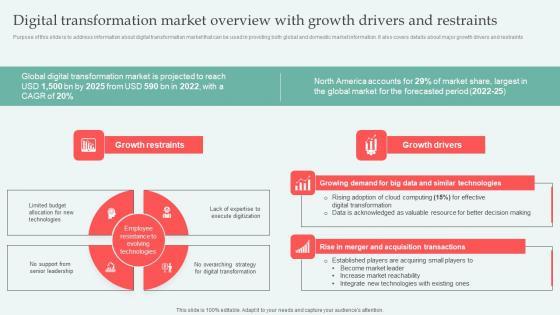 Purpose of this slide is to address information about digital transformation market that can be used in providing both global and domestic market information. It also covers details about major growth drivers and restraints From laying roadmaps to briefing everything in detail, our templates are perfect for you. You can set the stage with your presentation slides. All you have to do is download these easy to edit and customizable templates. Digital Transformation Market Digital Approaches To Increase Business Growth Formats Pdf will help you deliver an outstanding performance that everyone would remember and praise you for. Do download this presentation today. Purpose of this slide is to address information about digital transformation market that can be used in providing both global and domestic market information. It also covers details about major growth drivers and restraints