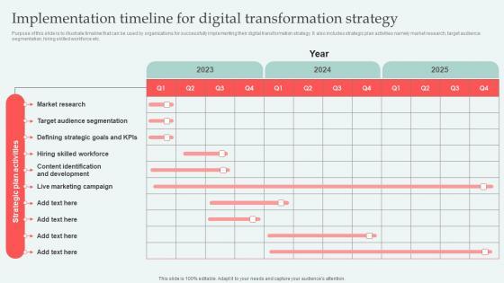 Purpose of this slide is to illustrate timeline that can be used by organizations for successfully implementing their digital transformation strategy. It also includes strategic plan activities namely market research, target audience segmentation, hiring skilled workforce etc. Find highly impressive Implementation Timeline Digital Approaches To Increase Business Growth Formats Pdf on Slidegeeks to deliver a meaningful presentation. You can save an ample amount of time using these presentation templates. No need to worry to prepare everything from scratch because Slidegeeks experts have already done a huge research and work for you. You need to download Implementation Timeline Digital Approaches To Increase Business Growth Formats Pdf for your upcoming presentation. All the presentation templates are 100 percent editable and you can change the color and personalize the content accordingly. Download now Purpose of this slide is to illustrate timeline that can be used by organizations for successfully implementing their digital transformation strategy. It also includes strategic plan activities namely market research, target audience segmentation, hiring skilled workforce etc.