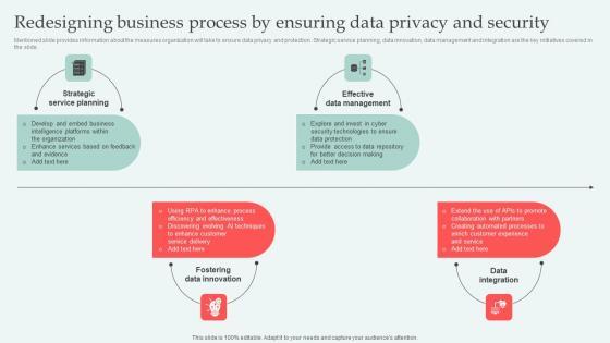 Mentioned slide provides information about the measures organization will take to ensure data privacy and protection. Strategic service planning, data innovation, data management and integration are the key initiatives covered in the slide. Explore a selection of the finest Redesigning Business Process Digital Approaches To Increase Business Growth Mockup Pdf here. With a plethora of professionally designed and pre made slide templates, you can quickly and easily find the right one for your upcoming presentation. You can use our Redesigning Business Process Digital Approaches To Increase Business Growth Mockup Pdf to effectively convey your message to a wider audience. Slidegeeks has done a lot of research before preparing these presentation templates. The content can be personalized and the slides are highly editable. Grab templates today from Slidegeeks. Mentioned slide provides information about the measures organization will take to ensure data privacy and protection. Strategic service planning, data innovation, data management and integration are the key initiatives covered in the slide.