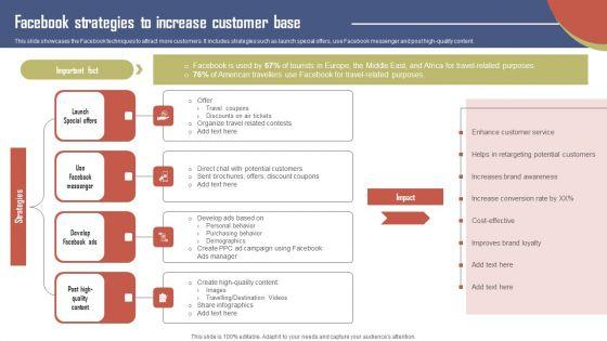 This slide showcases the Facebook techniques to attract more customers. It includes strategies such as launch special offers, use Facebook messenger and post high-quality content. Formulating a presentation can take up a lot of effort and time, so the content and message should always be the primary focus. The visuals of the PowerPoint can enhance the presenters message, so our Facebook Strategies To Increase Customer Base Effective Travel Marketing Guide For Improving Download PDF was created to help save time. Instead of worrying about the design, the presenter can concentrate on the message while our designers work on creating the ideal templates for whatever situation is needed. Slidegeeks has experts for everything from amazing designs to valuable content, we have put everything into Facebook Strategies To Increase Customer Base Effective Travel Marketing Guide For Improving Download PDF
