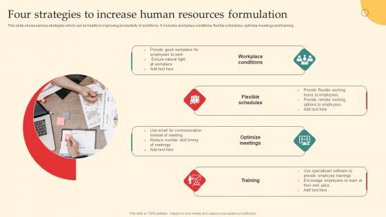 This slide shows various strategies which can be helpful in improving productivity of workforce. It includes workplace conditions,flexible schedules,optimize meetings and training. Showcasing this set of slides titled Four Strategies To Increase Human Resources Formulation Topics Pdf. The topics addressed in these templates are Workplace Conditions,Flexible Schedules,Optimize Meetings. All the content presented in this PPT design is completely editable. Download it and make adjustments in color,background,font etc. as per your unique business setting. This slide shows various strategies which can be helpful in improving productivity of workforce. It includes workplace conditions,flexible schedules,optimize meetings and training.