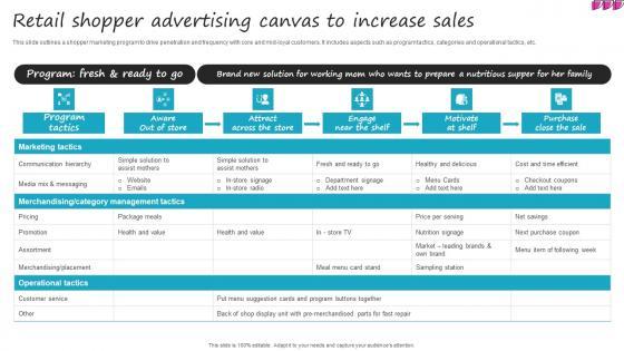 This slide outlines a shopper marketing program to drive penetration and frequency with core and mid-loyal customers. It includes aspects such as program tactics, categories and operational tactics, etc. Showcasing this set of slides titled Retail Shopper Advertising Canvas To Increase Sales Summary Pdf. The topics addressed in these templates are Retail Shopper Advertising, Canvas To Increase Sales, Operational Tactics, Mid Loyal Customers. All the content presented in this PPT design is completely editable. Download it and make adjustments in color, background, font etc. as per your unique business setting. This slide outlines a shopper marketing program to drive penetration and frequency with core and mid-loyal customers. It includes aspects such as program tactics, categories and operational tactics, etc.