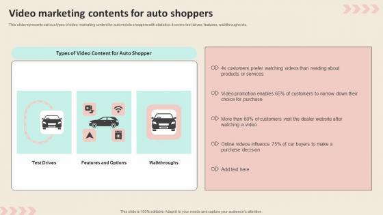 This slide represents various types of video marketing content for automobile shoppers with statistics. It covers test drives, features, walkthroughs etc. This Video Marketing Contents For Auto Shoppers Promotional Strategies To Increase Designs PDF from Slidegeeks makes it easy to present information on your topic with precision. It provides customization options, so you can make changes to the colors, design, graphics, or any other component to create a unique layout. It is also available for immediate download, so you can begin using it right away. Slidegeeks has done good research to ensure that you have everything you need to make your presentation stand out. Make a name out there for a brilliant performance. This slide represents various types of video marketing content for automobile shoppers with statistics. It covers test drives, features, walkthroughs etc.