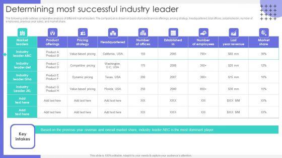 The following slide outlines comparative analysis of different market leaders. The comparison is drawn on basis of product service offerings, pricing strategy, headquartered, total offices, established in, number of employees, previous year sales, and market share. Create an editable Determining Most Successful Industry Leader Ppt PowerPoint Presentation File Professional PDF that communicates your idea and engages your audience. Whether youre presenting a business or an educational presentation, pre designed presentation templates help save time. Determining Most Successful Industry Leader Ppt PowerPoint Presentation File Professional PDF is highly customizable and very easy to edit, covering many different styles from creative to business presentations. Slidegeeks has creative team members who have crafted amazing templates. So, go and get them without any delay.