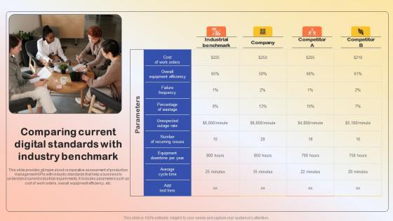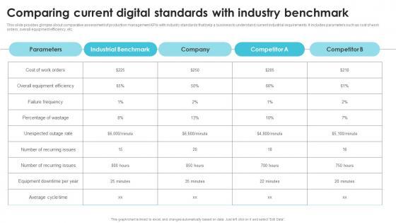 This slide provides glimpse about comparative assessment of production management KPIs with industry standards that help a business to understand current industrial requirements. It includes parameters such as cost of work orders, overall equipment efficiency, etc. Slidegeeks is one of the best resources for PowerPoint templates. You can download easily and regulate Comparing Current Digital Standards With Industry Benchmark Elements PDF for your personal presentations from our wonderful collection. A few clicks is all it takes to discover and get the most relevant and appropriate templates. Use our Templates to add a unique zing and appeal to your presentation and meetings. All the slides are easy to edit and you can use them even for advertisement purposes.