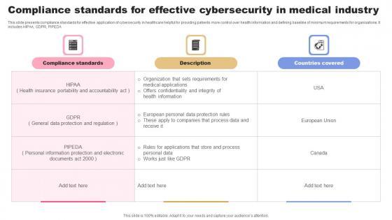 This slide presents compliance standards for effective application of cybersecurity in healthcare helpful for providing patients more control over health information and defining baseline of minimum requirements for organisations. It includes HIPAA, GDPR, PIPEDA Pitch your topic with ease and precision using this Compliance Standards For Effective Cybersecurity In Medical Industry Guidelines Pdf. This layout presents information on Compliance Standards, Description, Covered. It is also available for immediate download and adjustment. So, changes can be made in the color, design, graphics or any other component to create a unique layout. This slide presents compliance standards for effective application of cybersecurity in healthcare helpful for providing patients more control over health information and defining baseline of minimum requirements for organisations. It includes HIPAA, GDPR, PIPEDA