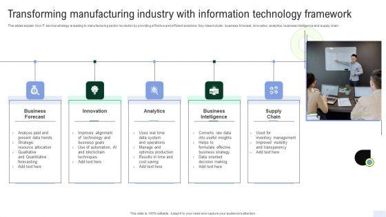 This slides explain how IT service strategy is leading to manufacturing sector revolution by providing effective and efficient solutions. Key roles include business forecast, innovation, analytics, business intelligence and supply chain. Presenting Transforming Manufacturing Industry With Information Technology Framework Ideas PDF to dispense important information. This template comprises five stages. It also presents valuable insights into the topics including Business Forecast, Innovation, Analytics. This is a completely customizable PowerPoint theme that can be put to use immediately. So, download it and address the topic impactfully.