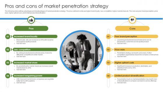 The following slide outlines advantages and disadvantages of market penetration strategy. The pros outlined in slide are higher brand loyalty, less competition, higher market share etc. The cons are poor brand perception, price wars, higher upfront cost, and limited product diversification. Whether you have daily or monthly meetings, a brilliant presentation is necessary. Marketing Growth Strategy To Pros And Cons Of Market Penetration Strategy SS V can be your best option for delivering a presentation. Represent everything in detail using Marketing Growth Strategy To Pros And Cons Of Market Penetration Strategy SS V and make yourself stand out in meetings. The template is versatile and follows a structure that will cater to your requirements. All the templates prepared by Slidegeeks are easy to download and edit. Our research experts have taken care of the corporate themes as well. So, give it a try and see the results. The following slide outlines advantages and disadvantages of market penetration strategy. The pros outlined in slide are higher brand loyalty, less competition, higher market share etc. The cons are poor brand perception, price wars, higher upfront cost, and limited product diversification.