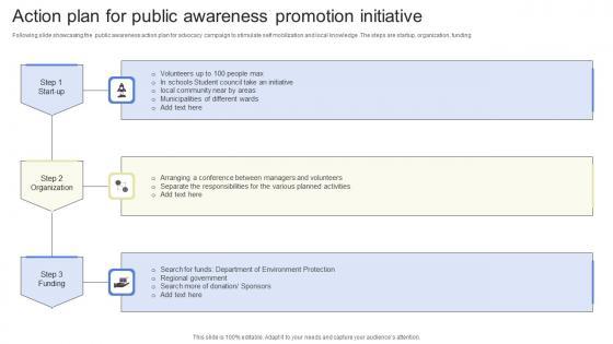 Following slide showcasing the public awareness action plan for advocacy campaign to stimulate self mobilization and local knowledge .The steps are startup, organization, funding.Showcasing this set of slides titled Action Plan For Public Awareness Promotion Initiative Brochure Pdf The topics addressed in these templates are Arranging Conference, Separate Responsibilities, Department Environment All the content presented in this PPT design is completely editable. Download it and make adjustments in color, background, font etc. as per your unique business setting. Following slide showcasing the public awareness action plan for advocacy campaign to stimulate self mobilization and local knowledge .The steps are startup, organization, funding