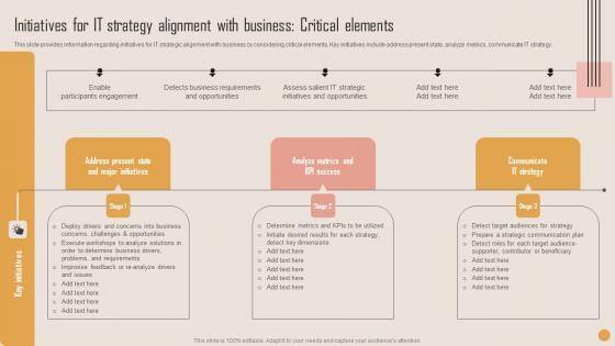 This slide provides information regarding initiatives for IT strategic alignment with business by considering critical elements. Key initiatives include address present state, analyze metrics, communicate IT strategy. The Initiatives For IT Strategy Alignment Playbook For Strategic Actions To Improve IT Performance Topics Pdf is a compilation of the most recent design trends as a series of slides. It is suitable for any subject or industry presentation, containing attractive visuals and photo spots for businesses to clearly express their messages. This template contains a variety of slides for the user to input data, such as structures to contrast two elements, bullet points, and slides for written information. Slidegeeks is prepared to create an impression. This slide provides information regarding initiatives for IT strategic alignment with business by considering critical elements. Key initiatives include address present state, analyze metrics, communicate IT strategy.