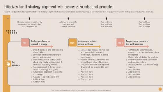 This slide provides information regarding initiatives for IT strategic alignment with business by considering foundational principles. Key initiatives include develop groundwork for IT strategy, assess key business drivers, etc. Are you searching for a Initiatives IT Strategy Alignment Playbook For Strategic Actions To Improve IT Performance Background Pdf that is uncluttered, straightforward, and original Its easy to edit, and you can change the colors to suit your personal or business branding. For a presentation that expresses how much effort you have put in, this template is ideal With all of its features, including tables, diagrams, statistics, and lists, its perfect for a business plan presentation. Make your ideas more appealing with these professional slides. Download Initiatives IT Strategy Alignment Playbook For Strategic Actions To Improve IT Performance Background Pdf from Slidegeeks today. This slide provides information regarding initiatives for IT strategic alignment with business by considering foundational principles. Key initiatives include develop groundwork for IT strategy, assess key business drivers, etc.