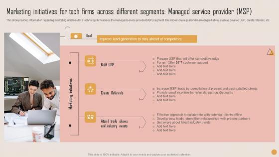 This slide provides information regarding marketing initiatives for a technology firm across the managed service providerMSP segment. The slide include goal and marketing initiatives such as develop USP, create referrals, etc. Create an editable Marketing Initiatives For Tech Firms Playbook For Strategic Actions To Improve IT Performance Background Pdf that communicates your idea and engages your audience. Whether you are presenting a business or an educational presentation, pre designed presentation templates help save time. Marketing Initiatives For Tech Firms Playbook For Strategic Actions To Improve IT Performance Background Pdf is highly customizable and very easy to edit, covering many different styles from creative to business presentations. Slidegeeks has creative team members who have crafted amazing templates. So, go and get them without any delay. This slide provides information regarding marketing initiatives for a technology firm across the managed service providerMSP segment. The slide include goal and marketing initiatives such as develop USP, create referrals, etc.