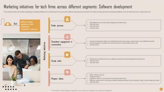 This slide provides information regarding marketing initiatives for a technology firm across the software development segment. The slide includes goal and marketing initiatives such as foster persona, create niche, etc. Slidegeeks is one of the best resources for PowerPoint templates. You can download easily and regulate Marketing Initiatives For Tech Playbook For Strategic Actions To Improve IT Performance Demonstration Pdf for your personal presentations from our wonderful collection. A few clicks is all it takes to discover and get the most relevant and appropriate templates. Use our Templates to add a unique zing and appeal to your presentation and meetings. All the slides are easy to edit and you can use them even for advertisement purposes. This slide provides information regarding marketing initiatives for a technology firm across the software development segment. The slide includes goal and marketing initiatives such as foster persona, create niche, etc.