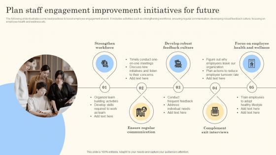 The following slide illustrates some best practices to boost employee engagement at work. It includes activities such as strengthening workforce, ensuring regular communication, developing robust feedback culture, focusing on employee health and wellness etc. From laying roadmaps to briefing everything in detail, our templates are perfect for you. You can set the stage with your presentation slides. All you have to do is download these easy to edit and customizable templates. Tactical Employee Engagement Action Planning Plan Staff Engagement Improvement Initiatives For Future Sample PDF will help you deliver an outstanding performance that everyone would remember and praise you for. Do download this presentation today.