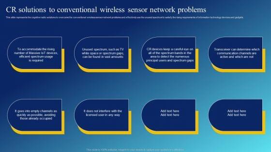 This slide represents the cognitive radio solutions to overcome the conventional wireless sensor network problems and effectively use the unused spectrum to satisfy the rising requirements of information technology devices and gadgets. Crafting an eye-catching presentation has never been more straightforward. Let your presentation shine with this tasteful yet straightforward Cognitive Sensing Innovation CR Solutions To Conventional Wireless Sensor Network Problems Rules PDF template. It offers a minimalistic and classy look that is great for making a statement. The colors have been employed intelligently to add a bit of playfulness while still remaining professional. Construct the ideal Cognitive Sensing Innovation CR Solutions To Conventional Wireless Sensor Network Problems Rules PDF that effortlessly grabs the attention of your audience Begin now and be certain to wow your customers